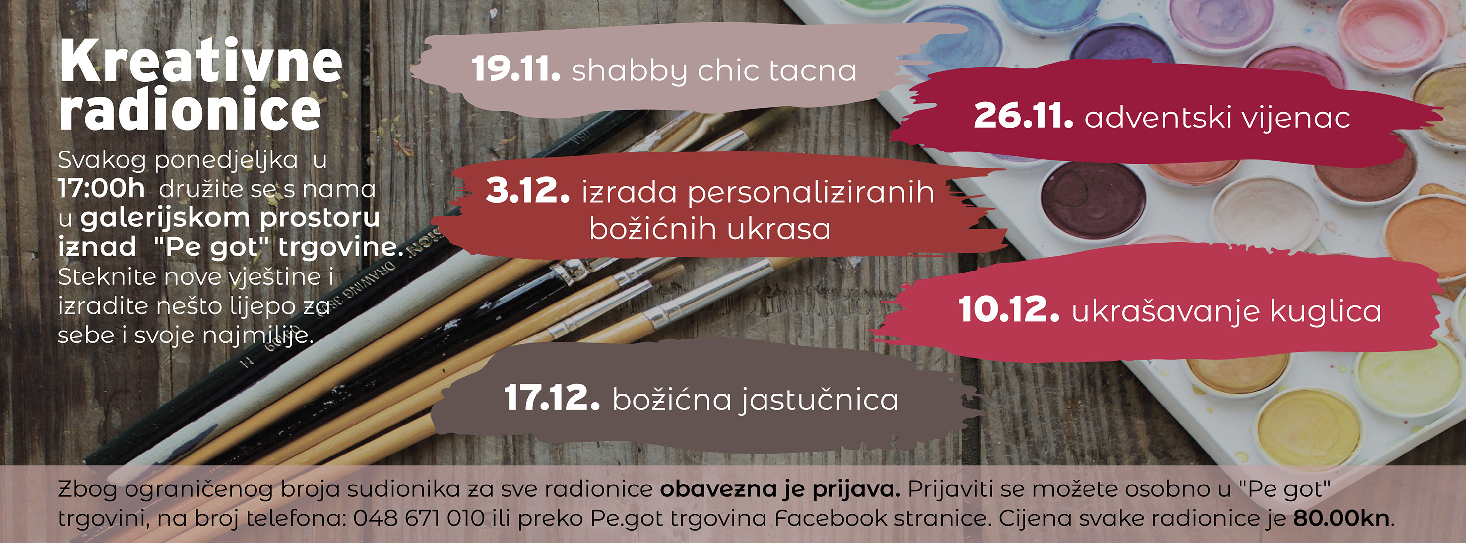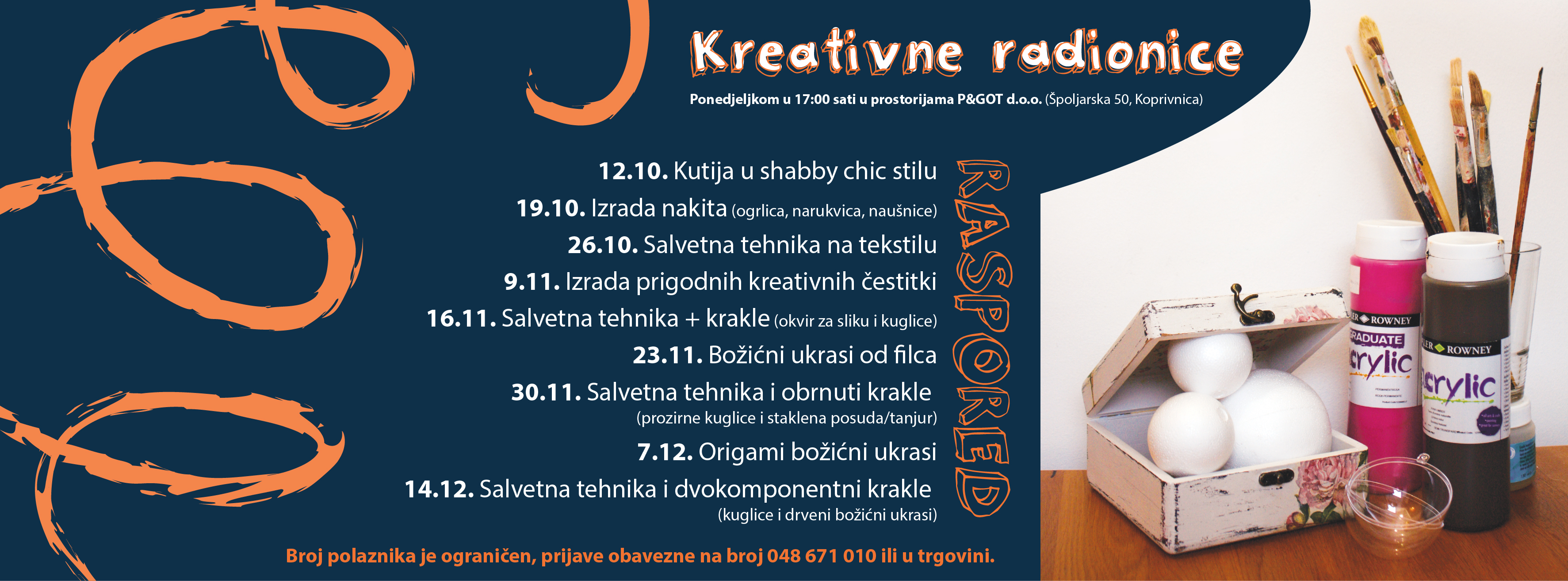 Nakon kratke pauze, ponovno krećemo sa kreativnim radionicama. Raspored radionica: 03.12.2012. Salvetna tehnika i Shabby chic 10.12.2012. Salvetna tehnika i krakle 17.12.2012. Salvetna tehnika i dvokomponentni krakle