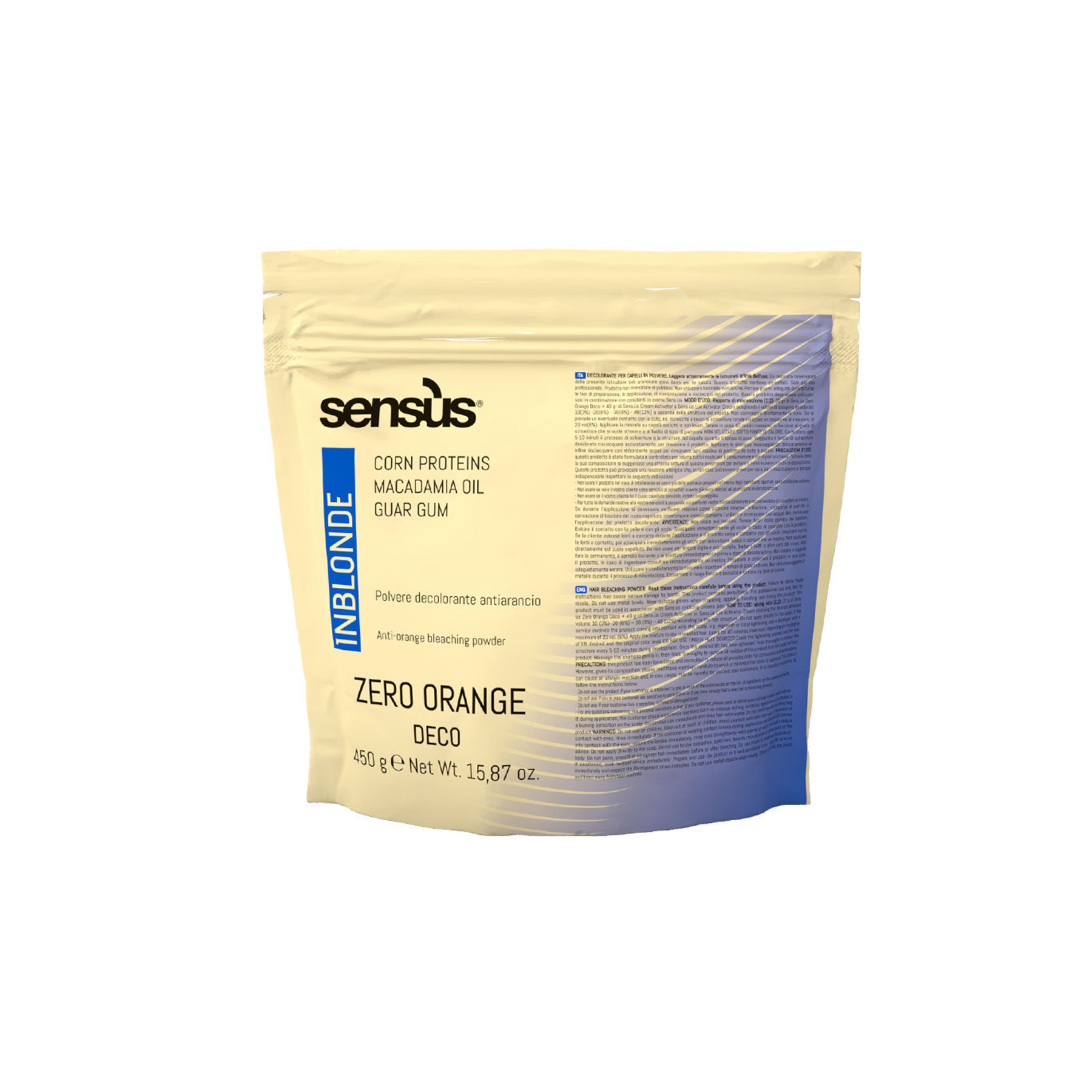 Sensus Zero Orange Deco je inovativni plavi prah za posvjetljivanje, dizajniran da neutralizira neželjene narančaste i žućkaste refleksije dok posvjetljuje kosu do 7 razina pod profesionalnim uvjetima. Idealan je za sve tehnike – bilo da radite globalno posvjetljivanje, pramenove, balayage ili working na regrowthu, a formulacija s anti-orange efektom osigurava hladnije i čišće plave tonove.