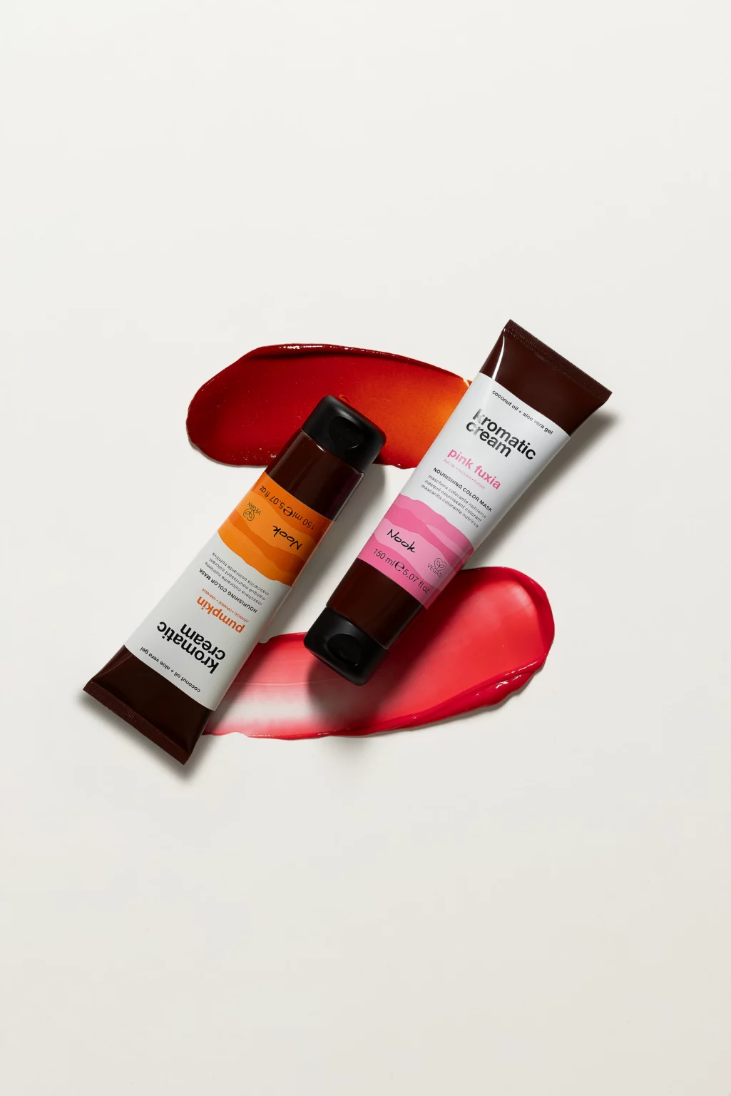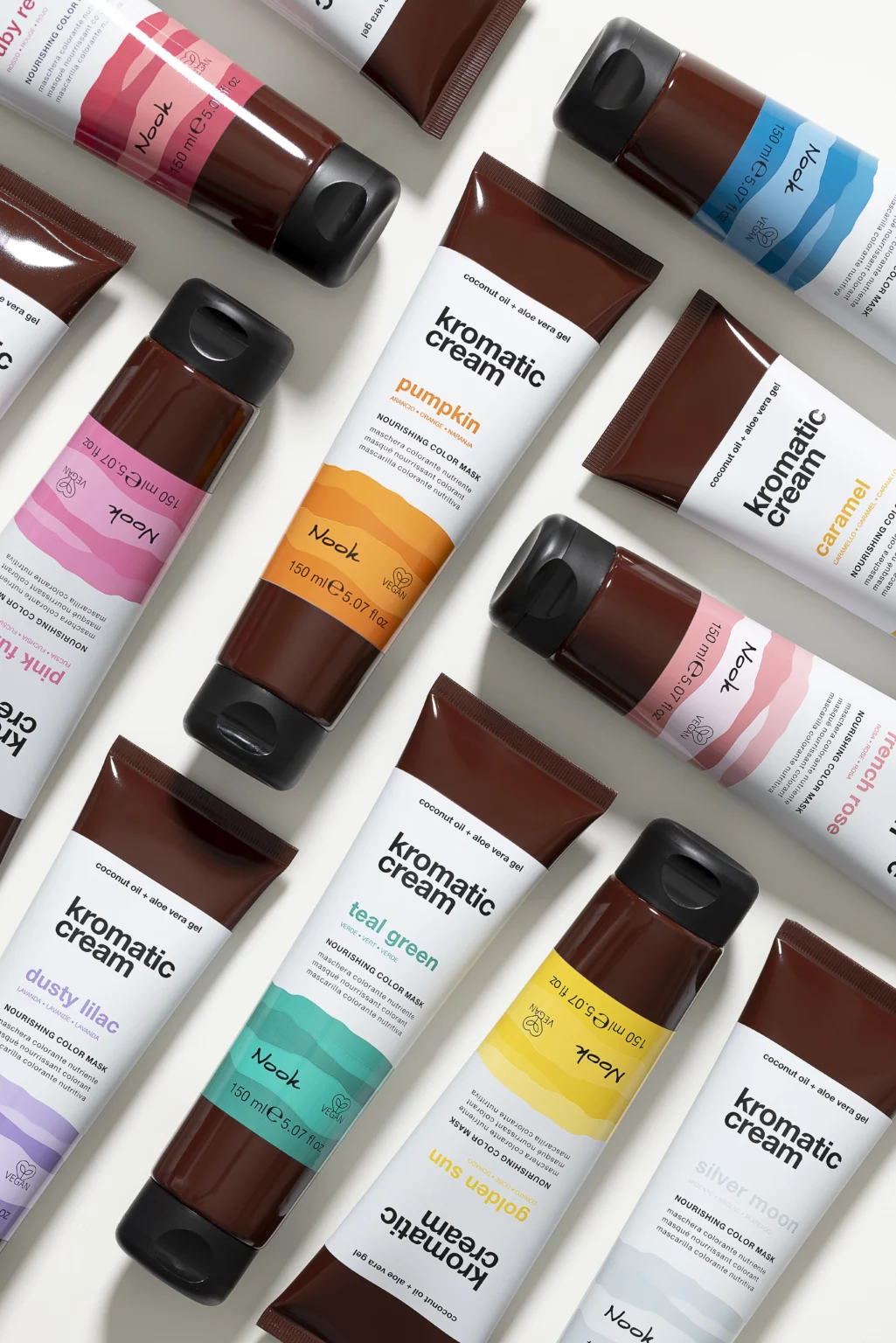 Nook Kromatic Cream je veganska, izravno pigmentirana maska za kosu koja kombinira njegu, hidrataciju i osvježenje kozmetičke boje u jednom koraku. Formulirana s više od 95 % sastojaka prirodnog podrijetla (ISO16128), obogaćena je organskim kokosovim uljem i aloe verom, te ne sadrži silikone, sulfate (SLES/SLS), MEA/DEA, parafine ni alkohol. Zahvaljujući svom kiselom pH-u, maska zatvara kutikulu vlasi, pruža visoki sjaj i poboljšava refleks svjetlosti.