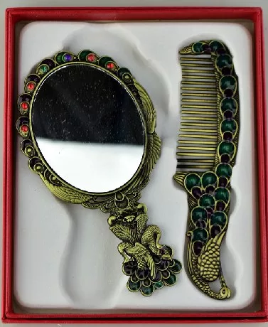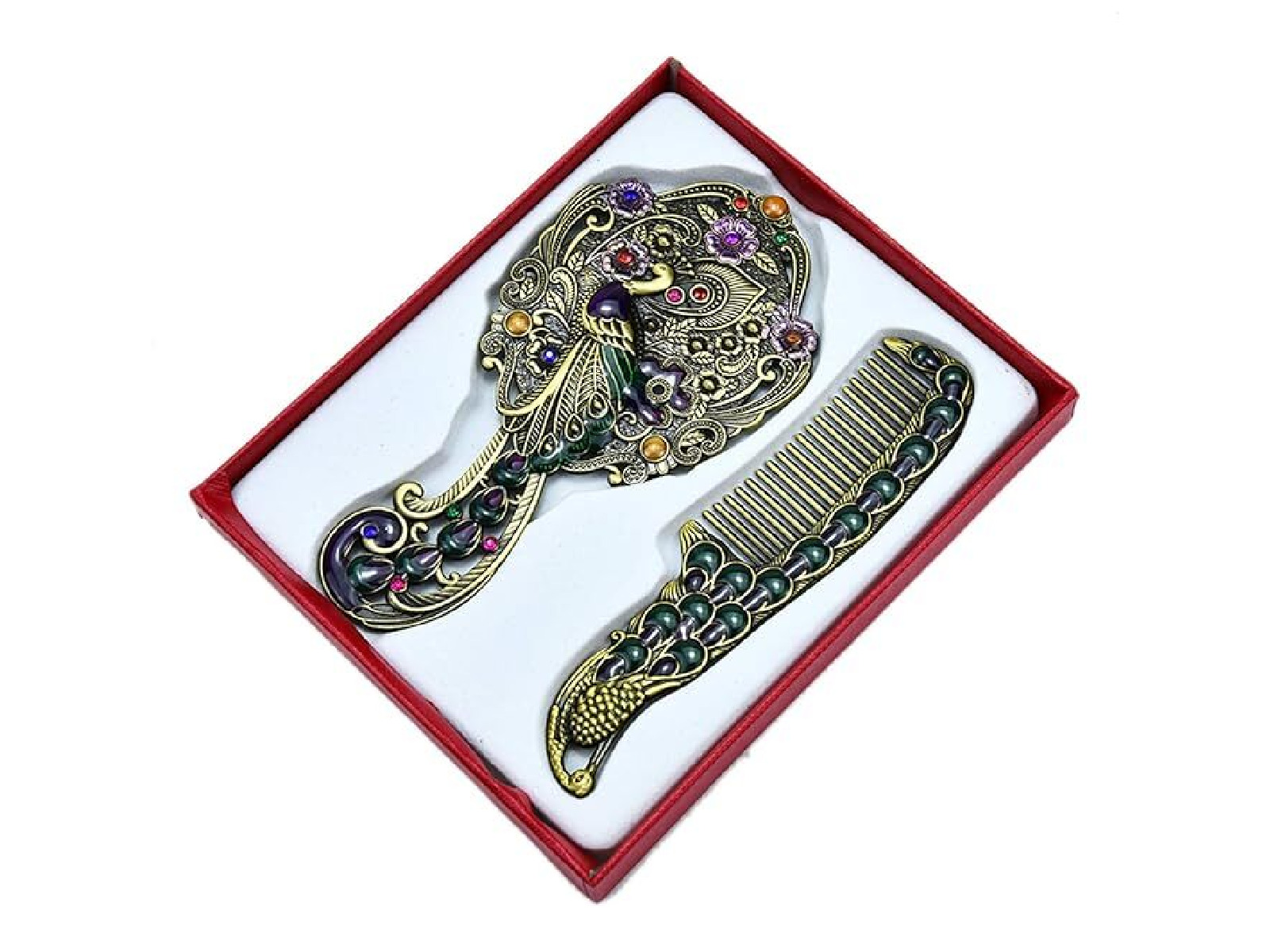 Set češalj i ogledalo u vintage stilu osigurat će da uvijek izgledate glamurozno. Set uključuje ogledalo i češalj, a možete izabrati između prekrasnih uzoraka paunova ili ruža. Set je optočen dekorativnim, sjajnim kamenčićima i dolazi u poklon kutiji što ga čini elegantnim poklonom za sve prigode. Set ogledalo i češalj dimenzijom je prikladan za putovanja i stane u gotovo svaku torbicu.