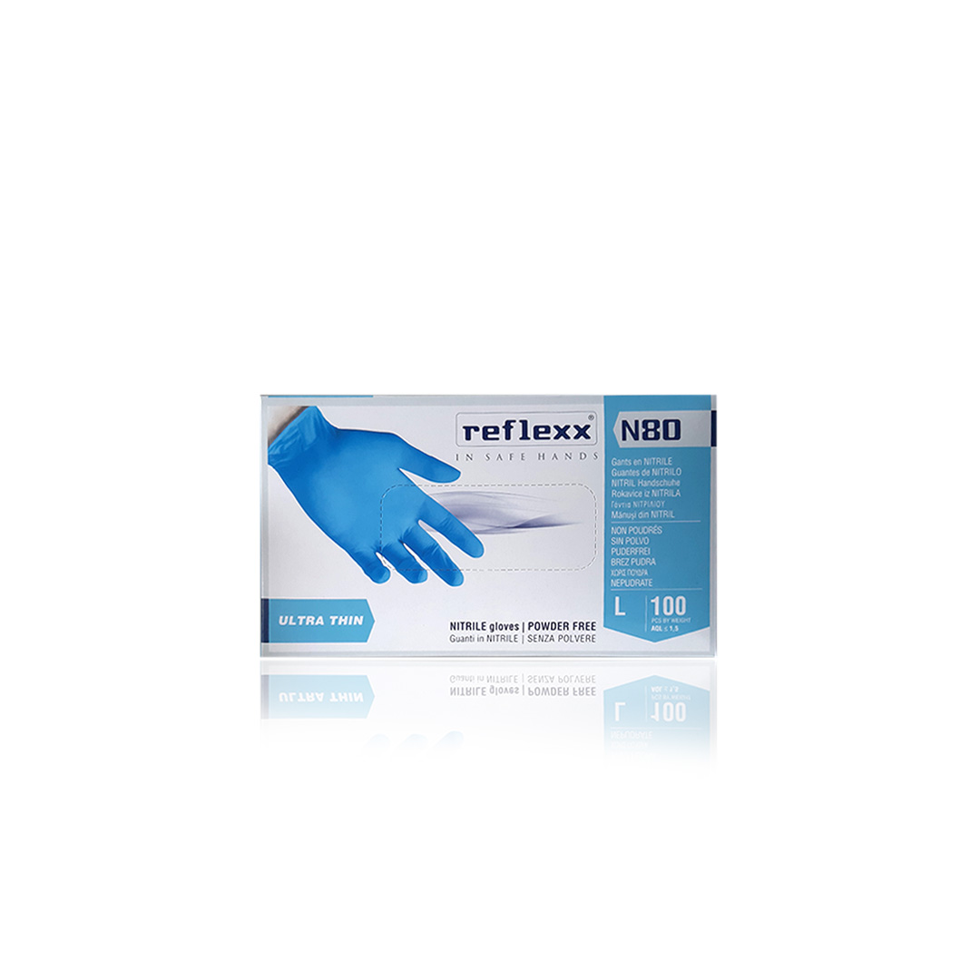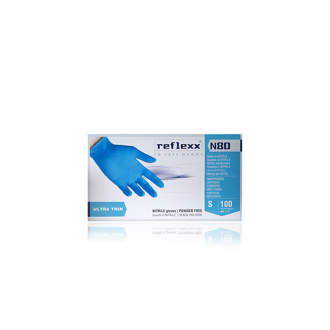 Nitrilne rukavice bez pudera, plave boje. Ultra tanke, idealne za zaštitu ruku od raznih nečistoća. Nije preporučeno za uporabu sa agresivnim sredstvima kao što su masti, ulja, kiseline i druga kemijska sredstva.
