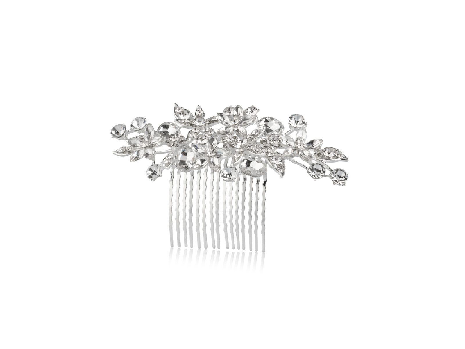 Ovaj romantičan ukras za kosu srebrne boje ukrašen je svjetlucavim cvjetnim detaljem i savršen je izbor za polupodignute svečane frizure. Rubovi su savitljivi i potpuno prilagodljivi vašoj kosi, pružajući udobnost i sigurnost nošenja tijekom cijelog dana.