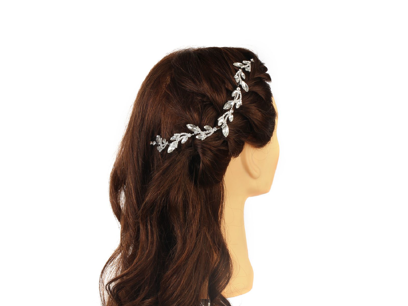 Dodajte dašak elegancije svojoj svečanoj frizuri ovim prekrasnim ukrasom za kosu. Ukras za kosu srebrne boje, dužine 28 cm ima listiće ukrašene svjetlucavim cirkonima. Ovaj luksuzni dodatak frizuri prilagodljiv je svakom stilu svečanih frizura i može se nositi na više načina.